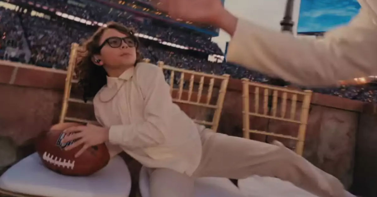 Bad Bunny despierta a un niño que se quedó dormido en sillas; la escena conecta con una experiencia compartida en muchas familias: fiestas largas, adultos conversando, niños agotados. El balón de fútbol americano en brazos mezcla lo estadounidense con lo familiar.