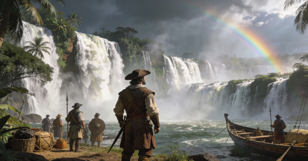 Mientras navegaba el río Iguazú en bergantines construidos en el camino, Cabeza de Vaca se topó repentinamente con un espectáculo natural que tomó su aliento: enormes cascadas de agua, cayendo desde alturas de más de cien metros, creando un ruido ensordecedor y columnas de spray que se elevaban hasta el cielo.