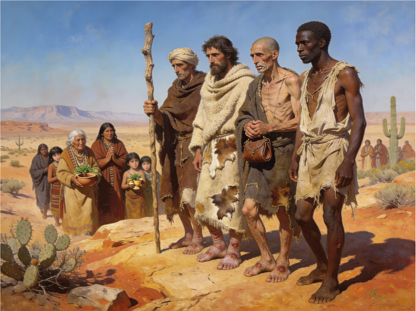 Este fue un viaje de desolación absoluta. Los tres españoles (Cabeza de Vaca, Alonso del Castillo Maldonado y Andrés Dorantes de Carranza) y su compañero Estevanico—un esclavo moro de origen norteafricano—estaban extremadamente delgados, sus ropas eran harapos, sus pies estaban destrozados. Pero sus reputaciones como curanderos les precedían. Poblaciones indígenas venían de millas de distancia para ser curados por estas figuras legendarias.