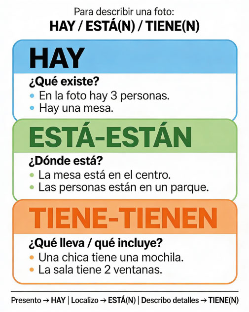Describir una imagen en español va de una cosa: ayudar a la otra persona a “ver” la escena. Para eso, necesitas separar tres ideas distintas: qué existe (hay), dónde está (está/están) y qué tiene (tiene/tienen).