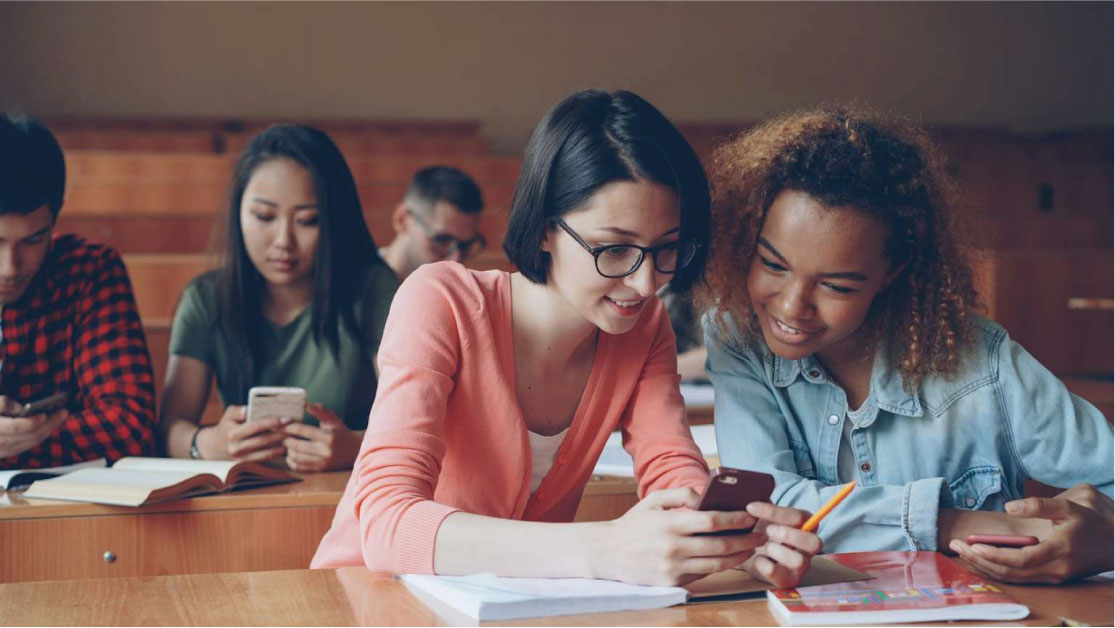 Algunos estudiantes tienen un cuaderno y un bolígrafo, y otros tienen un móvil en la mano. Están mirando el móvil y hablando.