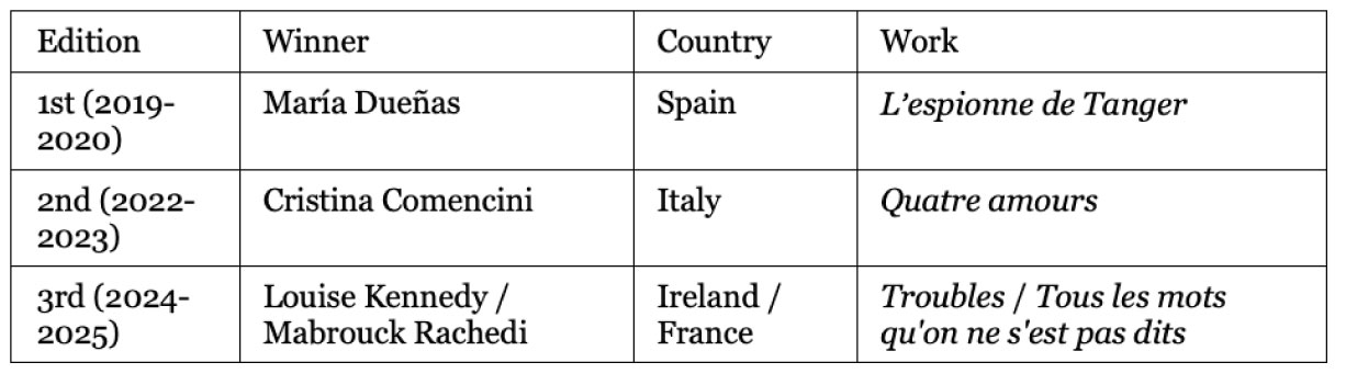 The prize brings together eleven novels from eleven member countries of the Council of Europe: Austria, France, Germany, Ireland, Italy, Portugal, Spain, Sweden, Switzerland, Ukraine and the United Kingdom.