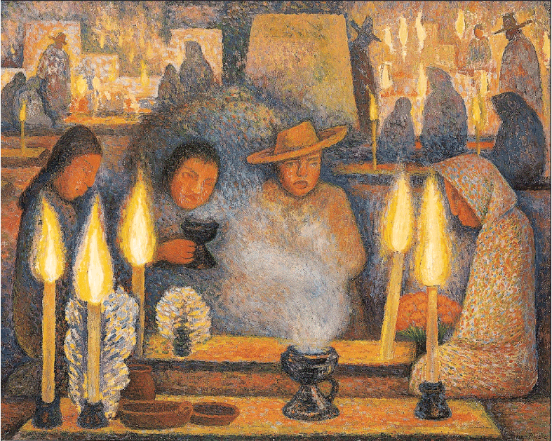 Avec l’arrivée des Espagnols, d’autres éléments et pratiques ont été incorporés qui reflètent le syncrétisme entre deux cultures : la vision du monde des peuples indigènes et les croyances religieuses du catholicisme. Les croix, représentations du catholicisme, ou les boissons distillées, qui n’existaient pas auparavant sous ces latitudes, en sont un exemple. Ou encore le pain des morts (aujourd’hui, ce pain est fabriqué avec de la farine de blé, du sucre, de l’œuf et de la levure et est décoré d’une figure d’os croisés saupoudrés de sucre), un élément si traditionnel de cette célébration, qui est apparu avec l’arrivée de la farine. En outre, ce sont les Espagnols qui ont fait coïncider la fête des morts des indigènes – elle durait deux mois – avec les célébrations catholiques de la Toussaint (1er et 2 novembre).