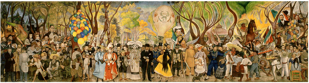 Mais qu’est-ce qu’une catrina ? Une catrina, en dialecte mexicain, est une personne élégante et bien habillée, typique de l’aristocratie du XIXe siècle. C’est ainsi que le célèbre muraliste Diego Rivera reprendra plus tard la figure de la Calabera garbancera pour la transformer en catrina. Le peintre et muraliste mexicain a laissé, parmi ses œuvres les plus importantes, Sueño de una tarde dominical en la Alameda Central (Rêve d’un dimanche après-midi dans l’Alameda Central). Cette œuvre, actuellement exposée au musée de la peinture murale Diego Rivera, est un autoportrait de l’artiste dans lequel il est accompagné de diverses figures emblématiques de l’histoire du Mexique.