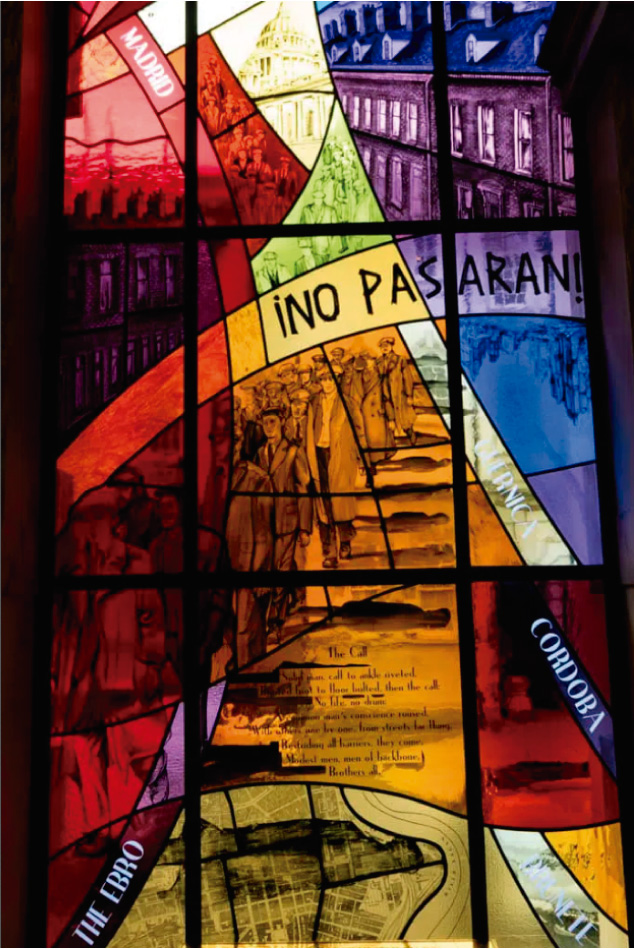 En concreto, podemos encontrar esta vidriera, inaugurada el 24 de noviembre de 2015 por el alcalde Arder Carson, del Sinn Fein, que resalta dicha contribución, fruto del acuerdo de todos los partidos políticos del Ayuntamiento. En ella destaca el lema « ¡No pasarán! (en francés « Ils ne passeront pas! », y en inglés « They shall not pass »), usado para expresar la determinación de defender una posición contra el enemigo, que en castellano, ha llegado a ser un lema internacional antifascista y todavía se usa así en los círculos políticos de izquierda.